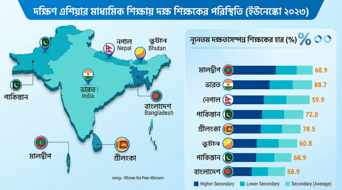 দক্ষিণ এশিয়ার দেশগুলোর মধ্যে মাধ্যমিক স্তরে ন্যূনতম দক্ষতাসম্পন্ন শিক্ষকের হারে সবার নিচে অবস্থান করছে বাংলাদেশ। ইউনেস্কো প্রকাশিত ‘বিশ্ব শিক্ষা পরিসংখ্যান’ অনুযায়ী, দেশের মাধ্যমিক স্তরের মাত্র read more