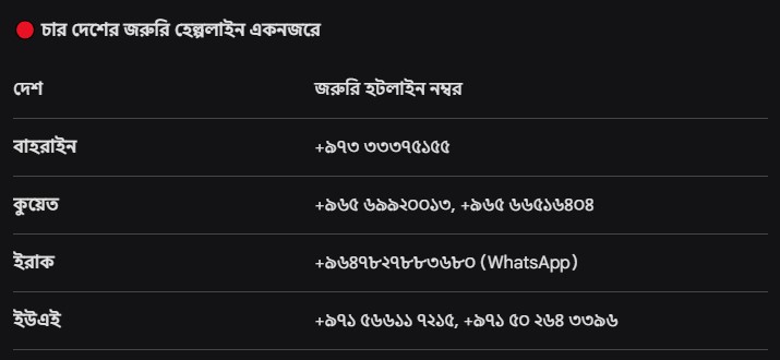পরিস্থিতি বিবেচনা করে মধ্যপ্রাচ্যের চারটি দেশ—ইরাক, কুয়েত, বাহরাইন ও সংযুক্ত আরব আমিরাত—এ অবস্থানরত বাংলাদেশিদের জন্য তাদের নিজ নিজ দূতাবাস থেকে বিশেষ সতর্কবার্তা ও জরুরি নির্দেশনা জারি করা হয়েছে: