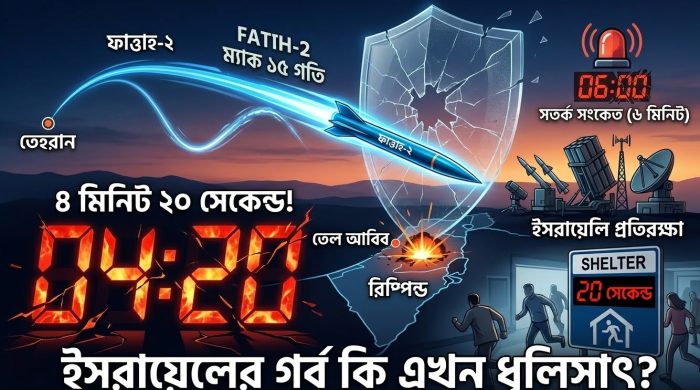 ইসরায়েলের অত্যাধুনিক রাডার স্ক্রিনে সংকেত ভেসে ওঠার আগেই কি ধেয়ে আসছে ধ্বংসযজ্ঞ? সময় মাত্র ৪ মিনিট ২০ সেকেন্ড। তেহরান থেকে নিক্ষেপ করার পর এইটুকুন সময়ের মধ্যেই ইরানের নতুন হাইপারসনিক মিসাইল